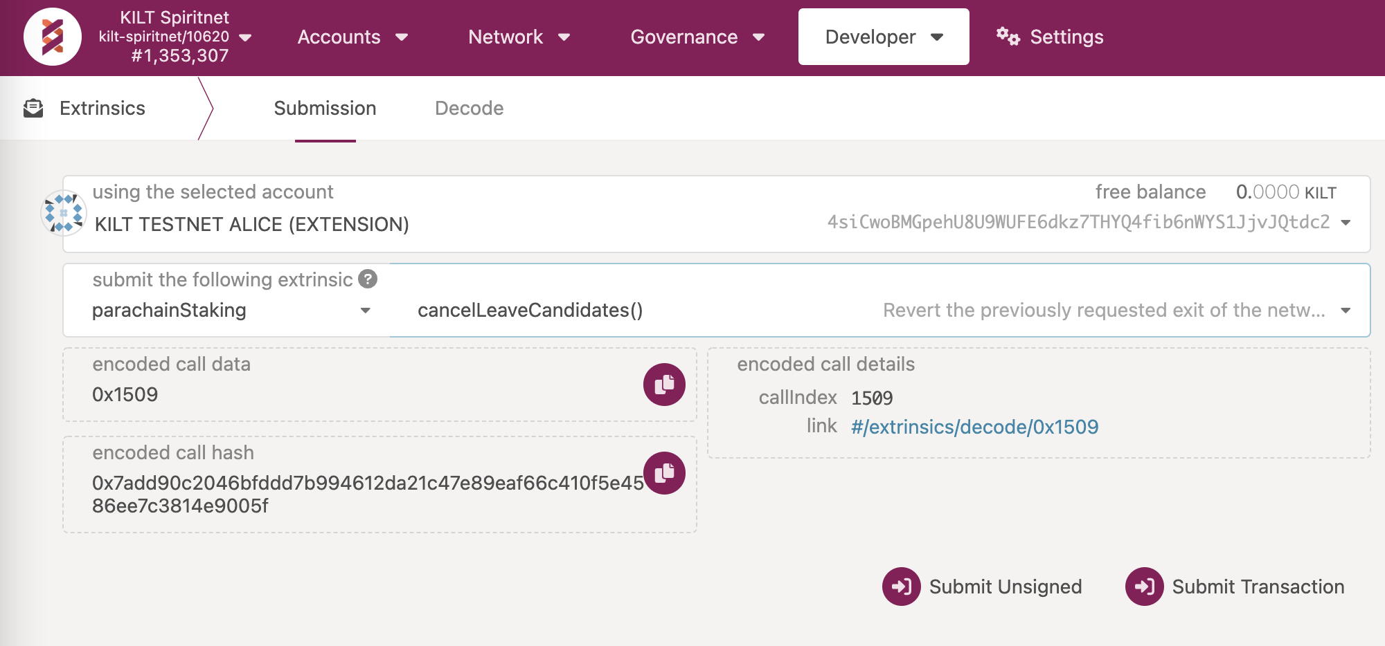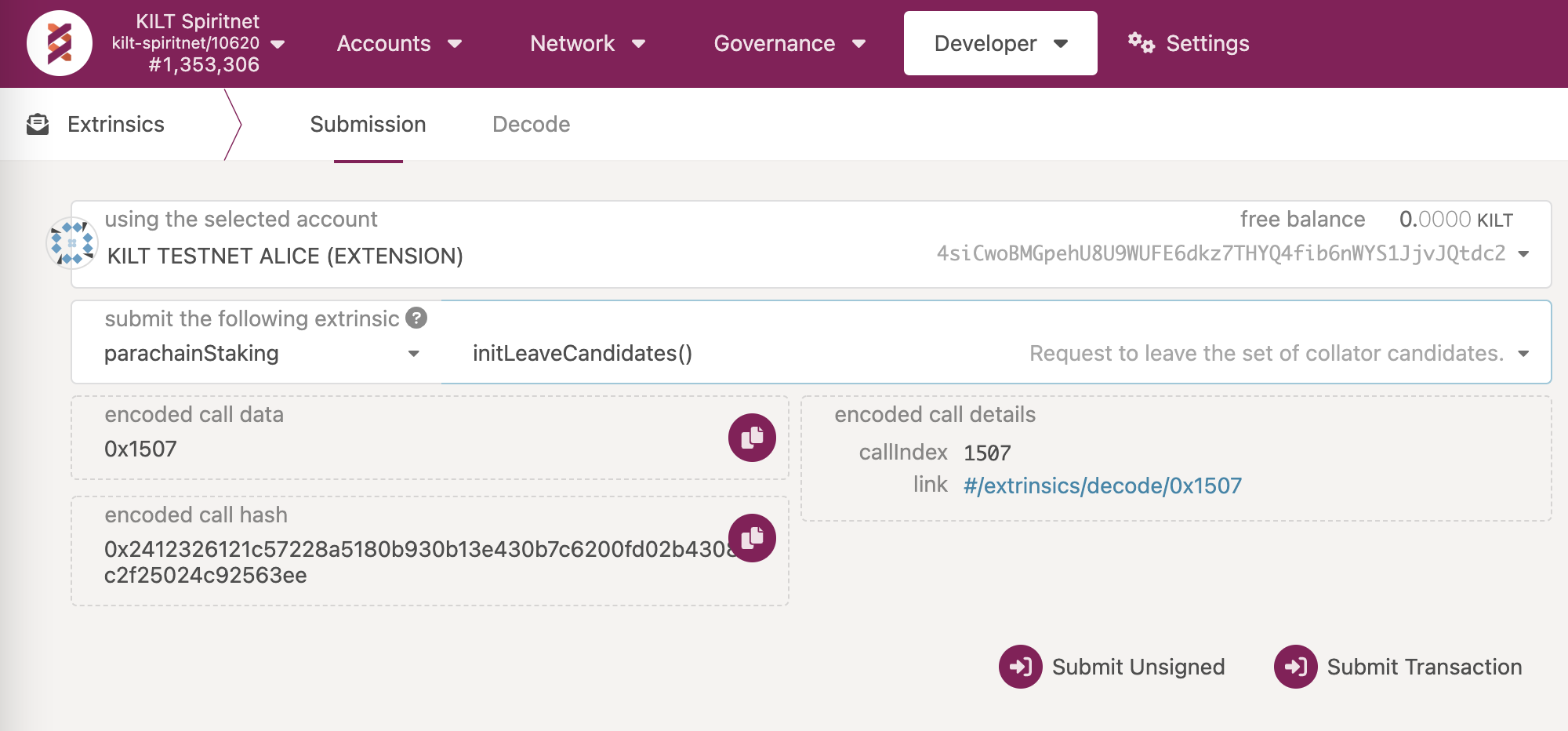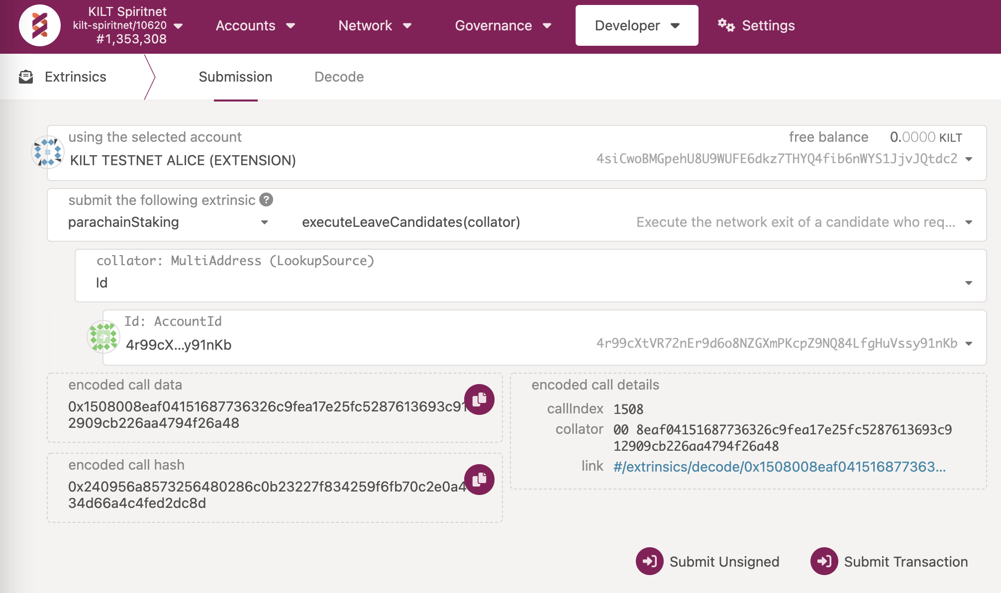 In the Polkadot JS Apps (wss://spiritnet.kilt.io, or wss://peregrine.kilt.io) go to Developer -> Extrinsics -> Submission